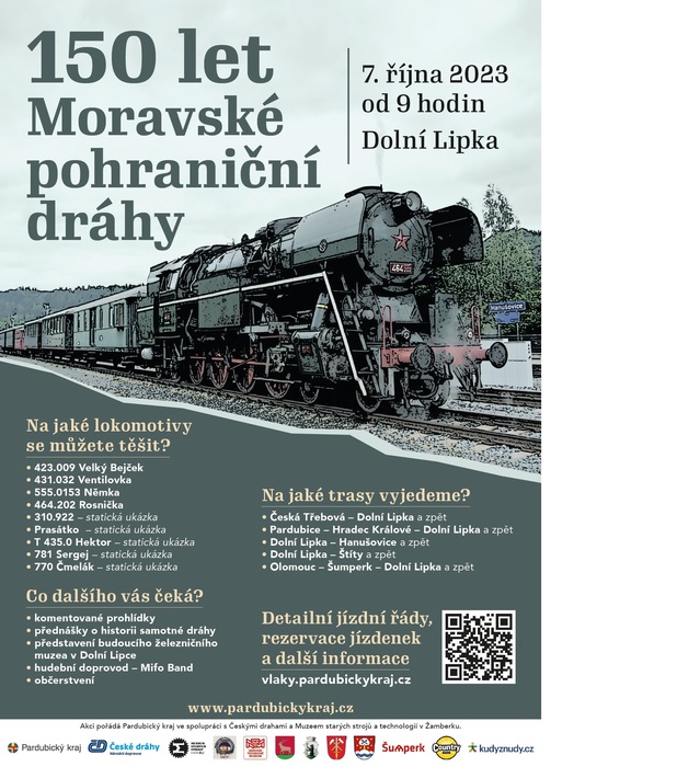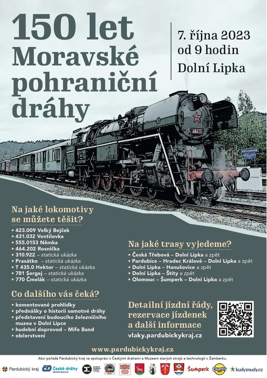 V sobotu 7. října pořádá Pardubický kraj ve spolupráci s Muzeem starých strojů a technologií v Žamberku a Českými drahami oslavu 150 let od zahájení provozu na Moravské pohraniční dráze (Šternberk - Šumperk - Hanušovice - Dolní Lipka). Hlavní část oslav se bude konat v prostorách železniční stanice v Dolní Lipce od 9 do 16 hodin. Při této příležitosti budou zavedeny čtyři parní vlaky, které budou svážet cestující z celého kraje, ale také z Olomouce.