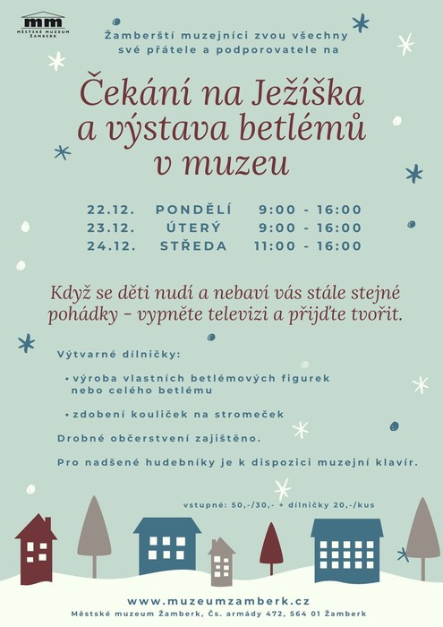 Zároveň jsme pro vás připravili třídenní akci Čekání na Ježíška. Až Vás přestane bavit televize a děti se budou nudit, tak nezapomínejte, že muzeum bude otevřeno v pondělí a úterý od 9:00 do 16:00 a na Štědrý den od 11:00 do 16:00.